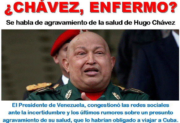 Venezuela vive una situación de inestabilidad política y social debido a la enfermedad del presidente electo Hugo Chávez. A ciencia cierta nadie sabe nada de su presidente, el cual no pudo tomar posesión, pero rige aparentemente por medio del vicepresidente Maduro los destinos de esa nación. Esta incógnita respecto a la salud del presidente da lugar a todo tiempo de hipótesis, teorías y comentarios. Unos afirman que está muerto, otro que este en coma, algunos que esta con respiración asistida y muchos que  en realidad es una pantalla para que Maduro gobierne, porque Chávez no se entera de nada debido a su gravedad.