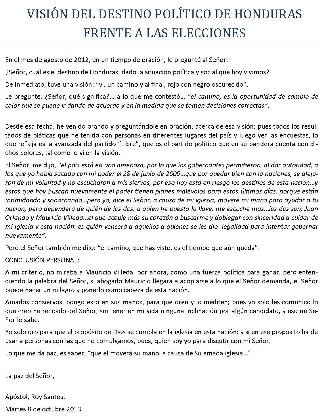 Pastor: Roy Santos,con todo respeto,su comentario deja plasmada la idea,de simpatia por alguno de los partidos politoco lllamese Liberal o Nacional.Mi estimado ministro del Senor,se olvida usted que Dios no quiere tener alianza con los impios; cuando Josafat,hizo alianza con el Rey impio Acab,Dios le dio una tremenda reprimenda,asi que debemos de tener sumo cuidado!! con este tipo de opiniones;no hay que olvidarse de que hay dos voluntades,de parte de Dios,permisiva y perfecta,asi que no creo que Dios tuerza su palabra para con estos politicos «CORRUPTOS». A demas de esto seria como avalar,que el golpe de Estado fue perfecto,sin investigar los desgnios malevolos de los golpistas,yo vivo en Washington D.C.Y la imagen y criterio que por aca se maneja es totalmente ajena a lo que alla se piensa? se sabe que fue propiciada por los RICOS Y POLITICOS DE LA NACION,esto seria decirle a los inescruplososos,AMEN, mientras el pueblo se muere de hambre.Los lobistas de aca parece hicieron muy buen trabajo,mi querido Pastor Roy Santos,y ademas fue contratada la firma de los ABOGADOS MAS PODEROSA DE USA,QUE ESTA EN SAN FRANCISCO CALIFORNIA LLAMA ORRIC,para realizar dicho golpe,pero a mas de eso,a los ricos,no les importa a los pobres,por eso no creo que debamos involucrar los principios divinos, con los perversos,y corruptos politicos de nuetra Nacion..Nuestra NACION esta, donde esta, solo, por los gobiernos de los dos partidos tradicionales,son los unicos que han gobernado,ellos tienen sumida a nuestra en ese flagelo de vida infrahumana.usted no puede responzabilzaer a nadie mas y decir que todo anda bien.Creo debemos orar para que Dios levante un verdadero baluarte,siervo de Dios como Jose,Danie,Sadrac,Salomon,etc.para un gobierno de justicia.