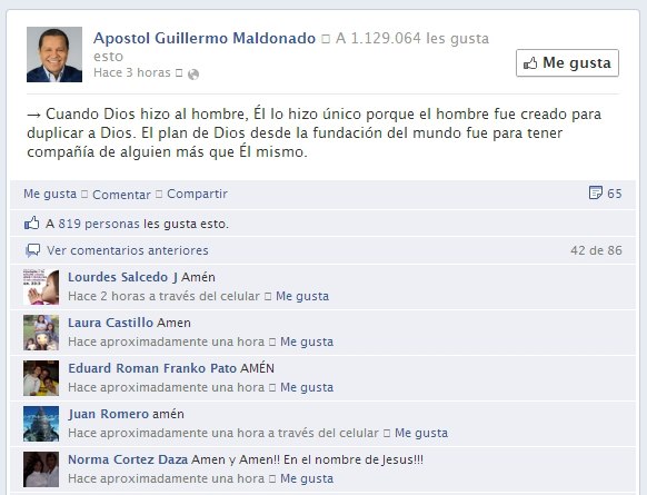 Por ejemplo, hace un tiempo atrás Guillermo Maldonado escribió en su cuenta de Facebook:“el hombre fue creado para duplicar a Dios”.