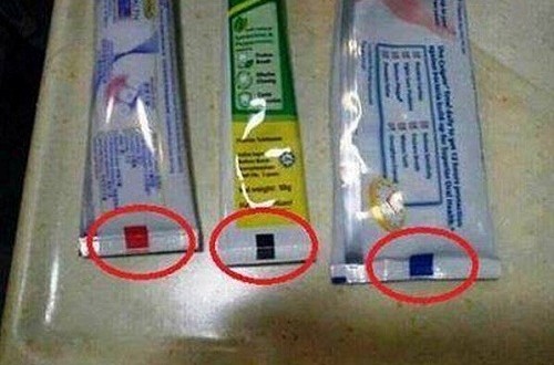 Pero entonces ¿Qué significan las marcas de colores en los tubos de la pasta de dientes?, las pastas de dientes son mezcladas y embotelladas por maquinas industriales, estas máquinas funciones a bases de sensores de luz que identifican el comienzo y el final de cada empaque dependiendo su tamaño, como lo que más se vende son pastas de dientes tamaño mediano a grande son las que más se producen y tratándose de largas tiras de aluminio compuesto se les marca con colores fuertemente pigmentados para que los sensores sepan dónde deben cortar y doblar cada tubo.