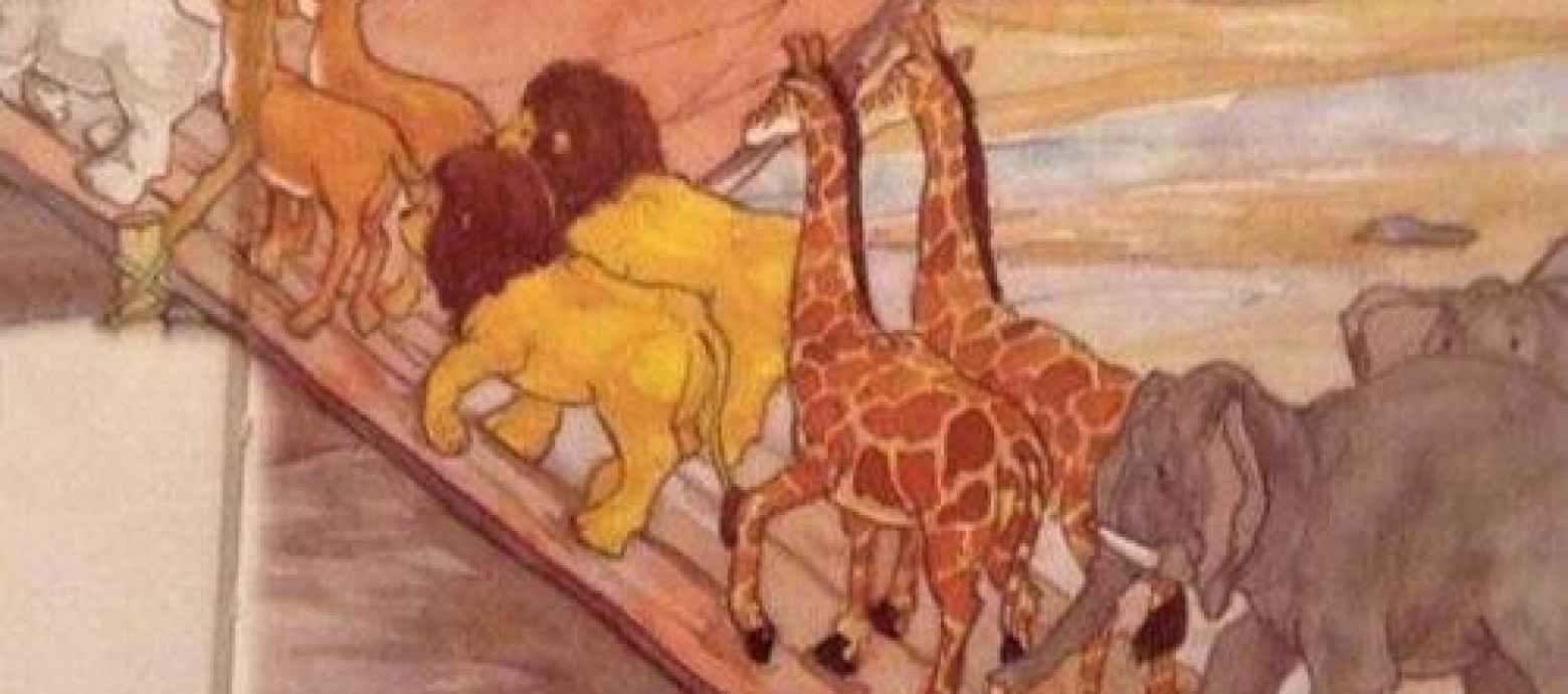 Todo parece indicar que el autor de esta imagen en un Antiguo Testamento para niños olvidó parte de la historia – aquella que cuenta que Noé tuvo que subir parejas de animales al arca, para preservar las especies – ya que dibujó en su particular el Arca de Noé con dos leones del mismo sexo.