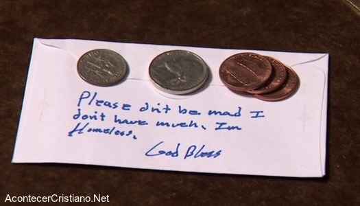 hombre-da-todo-diezmoCHARLOTTE, Carolina del Norte.- Un indigente dio todo lo que tenía en el diezmo a una iglesia, 18 centavos de dólar, pero dejó también una nota que conmovió al pastor.