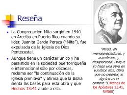[2] – Juanita García Peraza (n. Hatillo, Puerto Rico; 24 de junio de 1897 – f. , San Juan (Puerto Rico); 21 de febrero de 1970) Fue una religiosa puertorriqueña que fundó la Congregación Mita, la cual tiene la característica de ser la única iglesia cristiana protestante de origen puertorriqueño. Bajo la idea de que en ella se manifestaba el Espíritu Santo, llevó su religión a muchos otros países latinoamericanos y a Estados Unidos. Sus feligreses creen que el espíritu santo estaba en ella, aún hoy, consideran que MITA (Espirité de Vida) continúa dirigiendo la iglesia, si bien, a través de su discípulo Aarón. Basados en sus tres pilares : Amor, Libertad y Unidad. Tomado de https://es.wikipedia.org/wiki/Juanita_Garc%C3%ADa_Peraza.