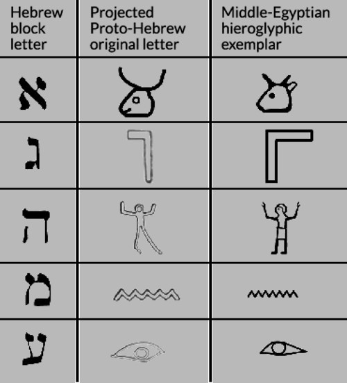 Comparación entre las letras del alfabeto Hebreo y símbolos Egipcios y Proto Hebraicos
