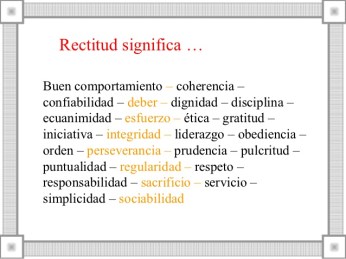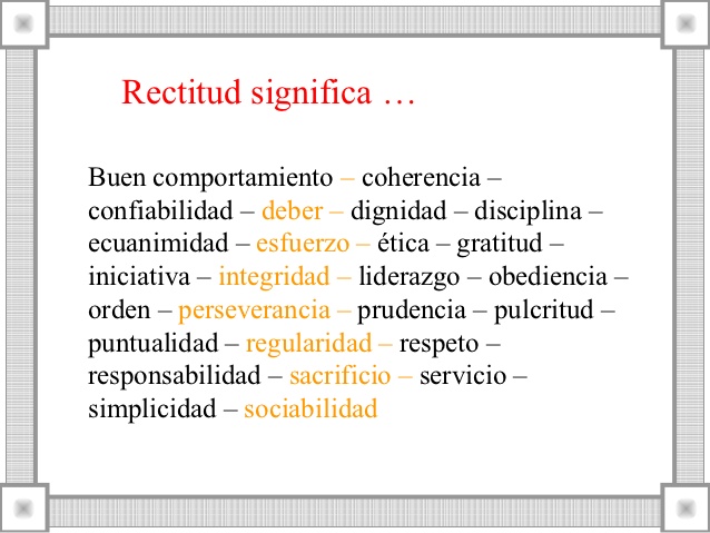 ¿Que entendemos nosotros por rectitud? Esta expresión tiene muchos sinónimos como por ejemplo; integridad, cabalidad, justo, honrado, cabal, inflexible, disciplinado, etc. Cuando hablamos de una persona recta hacemos referencia a un individuo que no tienen dobles, haciendo alusión a una persona que tiene claro hacia dónde va, que cree, y sabe para lograr lo que desea, sin desviarse del camino correcto, por lo que tienes clara las normas del juego.