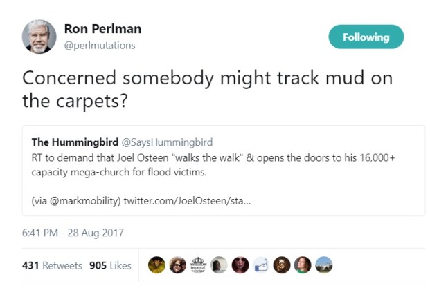 El actor Ron Perlman, de “Hijos de la Anarquía“, tuiteó una excelente y muy sarcástica respuesta a la hipocresía de Osteen, atacándolo y cuestionándolo por estar más preocupado de cuidar la limpieza y propiedades de su iglesia, que por los valores cristianos de caridad y apoyo que pretende encarnar: