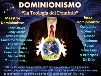 El mensaje de la teología del dominionismo ha calado en grupos evangélicos proclive a la prosperidad, éxito y poder. No es nada nuevo que la iglesia, dirigida por hombres ambiciosos, haya entrado a formar parte de la política, pues la historia está plagada de este hecho, ignorando lo dañino que fue para la fe cristiana tal excursión. Es utópico e ilusorio el pensar que podemos sanear el sistema, sin transformar al hombre. Es imposible transformar al hombre si este no experimenta un nuevo nacimiento en Cristo Jesús (Juan 3:7). Y si este cambio espiritual ocurre, entonces, el converso sabrá que “la amistad con el mundo es enemistad para con Dios” (Santiago 4:4).
