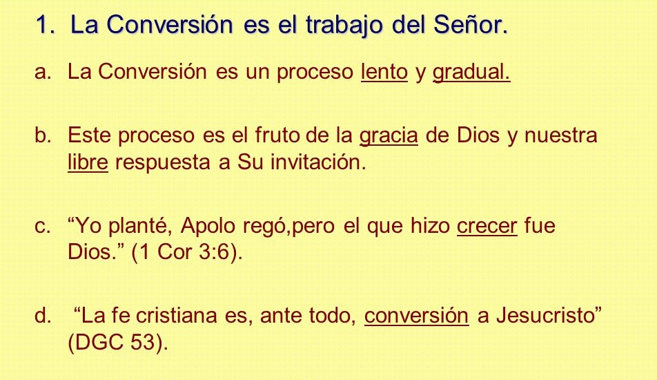 La Conversión es un proceso lento y gradual. Este proceso es el fruto de la gracia de Dios y nuestra libre respuesta a Su invitación. Yo planté, Apolo regó,pero el que hizo crecer fue Dios. (1 Cor 3:6). La fe cristiana es, ante todo, conversión a Jesucristo (DGC 53).