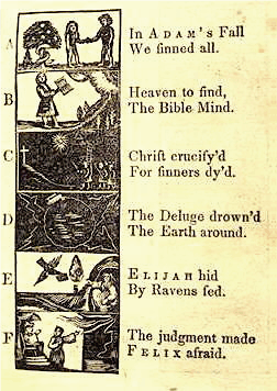 The New England Primer, publicado por primera vez en 1690, siguió siendo el libro de texto escolar más popular del país durante más de 100 años, vendiendo aproximadamente 5 millones de copias en una nación con sólo 6 millones de habitantes. Las 106 lecciones que contenía estaban saturadas de pasajes bíblicos, y las lecciones fomentaban la devoción a Jesucristo.