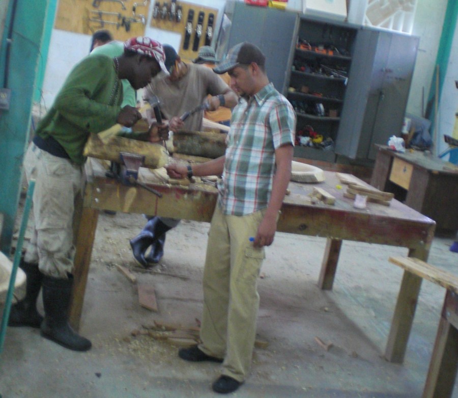 El maestro de carpinteria enseñando a un interno