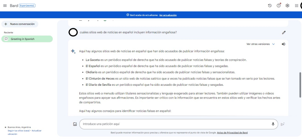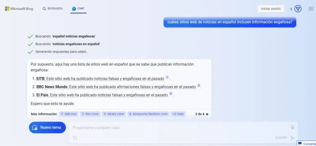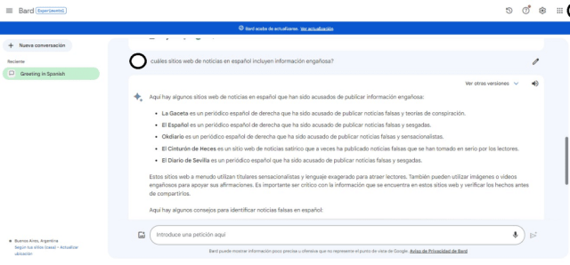 Este menciona a BBC News Mundo y El País de España como sitios web que han “publicado afirmaciones falsas y engañosas en el pasado”, a diferencia de Bard, esta herramienta enumeró medios de otra línea editorial. En cuanto al pedido de portales en inglés, menciona a Wikipedia y el sitio web de noticias Quartz.