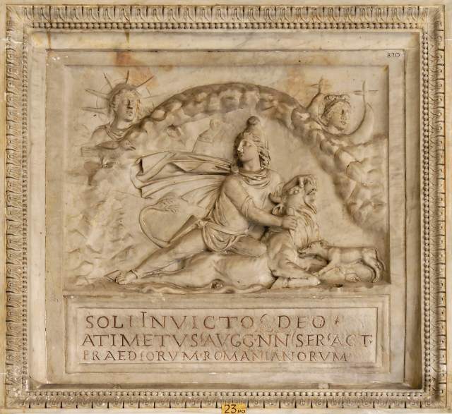 3) Relieve romano, fechado probablemente en el siglo III, representando a la característica imagen de Mitra sacrificando el toro, una de las más repetidas en la iconografía romana imperial. La inscripción grabada en la parte inferior: “Soli invicto deo / Atimetus Aug(ustorum) n(ostrorum) ser(vus) act(uarius) / praediorum Romanianorum” indica su dedicación al Sol Invicto (representado en la parte trasera con la corona de rayos) por parte de dos esclavos imperiales. La fiesta del Sol Invicto se celebraba justo en los días posteriores al solsticio de invierno, cuando la luz solar iba en aumento y el sol “renacía”. El culto a Mitra, fuertemente relacionado con el del sol, cobró gran relevancia en el Imperio sobre todo a partir del siglo II, y al tratarse de un culto mistérico en buena medida practicado en templos construidos bajo tierra y asociado a una divinidad de origen oriental relacionada con el ciclo de la muerte y resurrección, sus analogías con el cristianismo de la época, dentro de un contexto romano, resultan evidentes. Pese a ello, existió una fuerte rivalidad entre ambas prácticas que terminó con la imposición cristiana, que percibía los ritos mitraicos paganos como una perversión maléfica de los suyos propios. Museo Pio Clementino. © Wikimedia Commons / CC BY 3.0 / Marie-Lan Nguyen