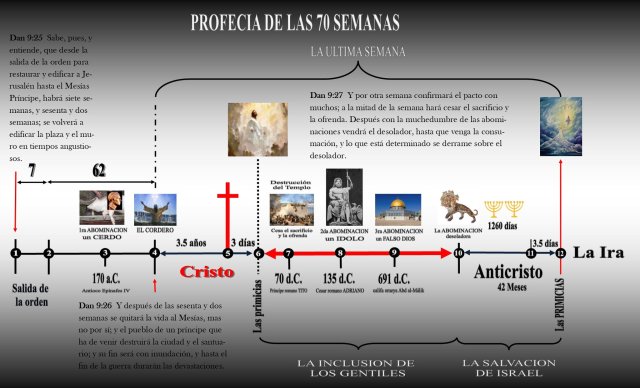 “… Y el Mesías afirmará su nueva alianza en una semana con muchos fieles convertidos; y a la mitad de esta semana cesarán las hostias y los sacrificios; y estará en el tiempo la abominación de la desolación; y durará la desolación hasta la consumación y el fin del mundo.» Dan 9:27. Si logramos hacer una línea de tiempo, la semana 70 estaría dividida en dos periodos donde el primero de 3.5 años concerniría al ministerio público del Mesías, y el segundo, correspondería al periodo donde a la Bestia (Anticristo) no solo se le permitiría hacer guerra contra los santos y vencerlos (Gran Tribulación) sino llevar a todos los habitantes de la tierra, a adorarle (Apo 13: 7-8). Lo otro a hacer notar en esta profecía es que, a la mitad de la semana, que coincide con la muerte el Mesías, Dios haría un pacto con los fieles ya que, por la sangre del cordero, los sacrificios por los pecados, cesarían (Heb 10:1-18)