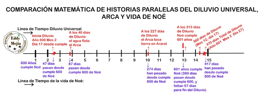 La historia bíblica del Diluvio Universal es un hecho verdadero que ocurrió en los tiempos que vivió un hombre llamado Noé. El Señor Jesucristo lo confirma como un hecho real en Mateo 24: 37-39. Dios trajo esta catástrofe mundial, advertida y planificada, como castigo por el pecado desenfrenado de la humanidad de ese tiempo, salvando solamente a Noé y su familia (8 personas) mediante una Arca de madera que mandó a construir a este varón justo. Para comprender toda la historia bíblica se debe saber que hay dos historias paralelas y entrelazadas: 1. Historia del Diluvio Universal de principio a fin y 2. Historia del Arca de Noé y su vida personal. Mediante un estudio matemático detallado de los datos presentados y usando el método de exposición sistemática literal de la Biblia se llega a verificar, en una línea de tiempo, que las dos historias son coherentes matemáticamente, concluyendo que el Diluvio duró 370 días en total de principio a fin(desde año 600 de Noé, mes 2 y día 17, Gn 7: 11, hasta año 601 de Noé, mes 2 y día 27, Gen. 8:14) y que desde el cumpleaños 600 de Noé hasta el fin del Diluvio pasaron 417 días, sin embargo, restando los primeros 47 días que transcurrieron entre el cumpleaños 600 y el inicio del Diluvio tenemos como resultado los mismos 370 días. Utilizando el estudio de la línea de tiempo entre las dos historias; también verificamos la misma duración (en días) de: 1. Tiempo entre flote y reposo del Arca (187 días), 2. Tiempo entre reposo del Arca y cumpleaños 601 de Noé (86 días) y 3.Tiempo entre cumpleaños 601 y fin del Diluvio (57 días). Dios es el Padre de las matemáticas y de toda ciencia, por lo tanto los datos que se presentan en la Biblia sobre el Diluvio Universal pueden y deben ser comprensibles lógicamente, de otra manera; la Biblia estuviera inconclusa, pero sabemos que no es así. Gloria a Dios que tuvo misericordia de la Humanidad y nos permitió un nuevo comienzo a través de su siervo Noé y ahora la nueva arca de Salvación espiritual para la Humanidad es su hijo Jesucristo (Jn 14:6).