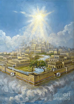 No hay obra alguna que se compare con la belleza de la ciudad de Dios, es grande en extremo, cúbica, y muy alta, toda construida de oro puro. Tiene un muro cuadrado que rodea toda la ciudad,con tres puertas en cada lado, cada puerta es una gran esfera de perla blanca, con un orificio en el centro para entrada de los seres celestiales. Todo es sorprendente y exactamente igual como la describió Juan en el libro de Apocalipsis.