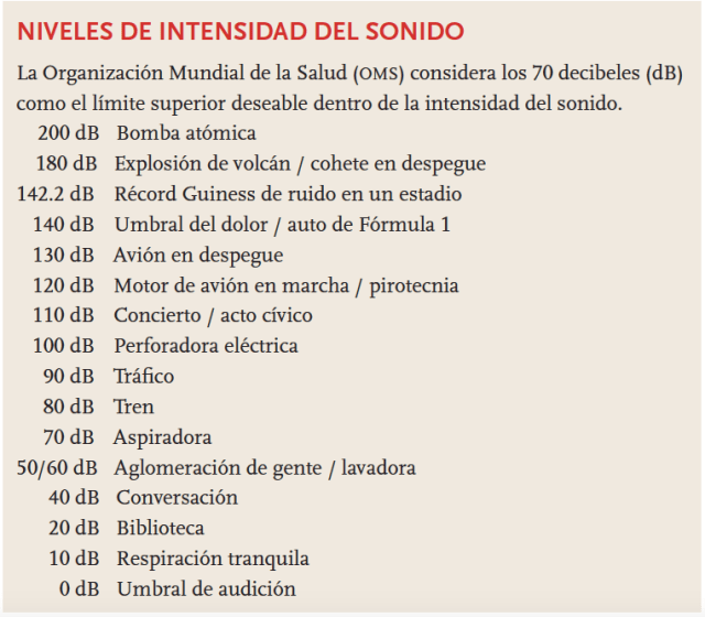 Existe en lo celulares una aplicación que puede medir los niveles de decibelio[1] que deben reinar dentro de cualquier ambiente, para evitar la “contaminación acústica”. Según los parámetros científicos, el oído humano tiene la capacidad de soportar, durante un tiempo prudencial, un volumen máximo equivalente a 90 dB. según normas de la Organización Mundial de la Salud (OMS), ya que el ruido fuerte es altamente perjudicial, y es uno de los factores medioambientales que provoca alteraciones físicas en las personas, después de la contaminación atmosférica[2].