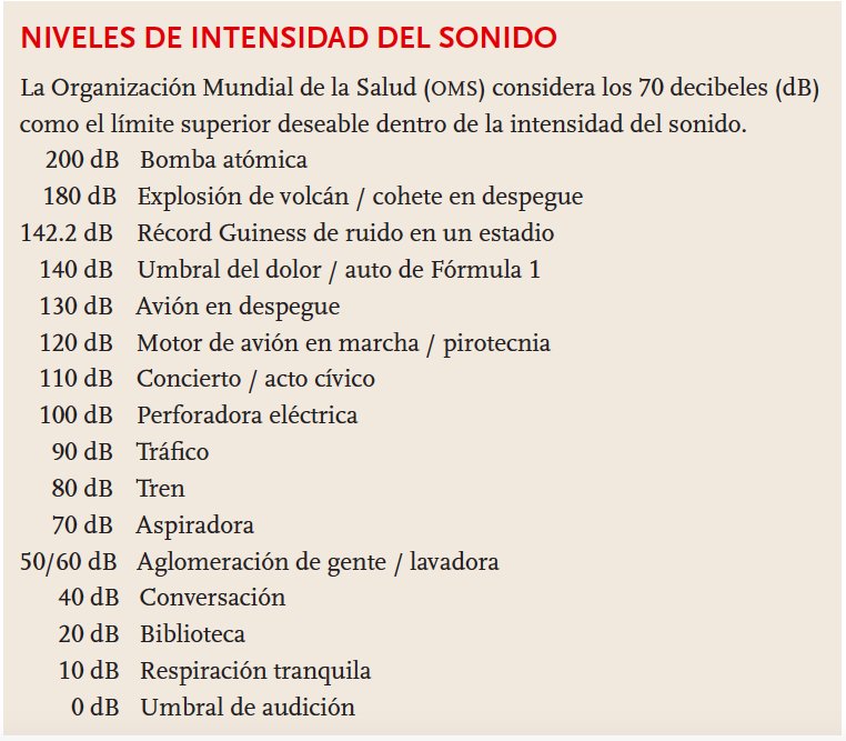 Existe en lo celulares una aplicación que puede medir los niveles de decibelio[1] que deben reinar dentro de cualquier ambiente, para evitar la “contaminación acústica”. Según los parámetros científicos, el oído humano tiene la capacidad de soportar, durante un tiempo prudencial, un volumen máximo equivalente a 90 dB. según normas de la Organización Mundial de la Salud (OMS), ya que el ruido fuerte es altamente perjudicial, y es uno de los factores medioambientales que provoca alteraciones físicas en las personas, después de la contaminación atmosférica[2].