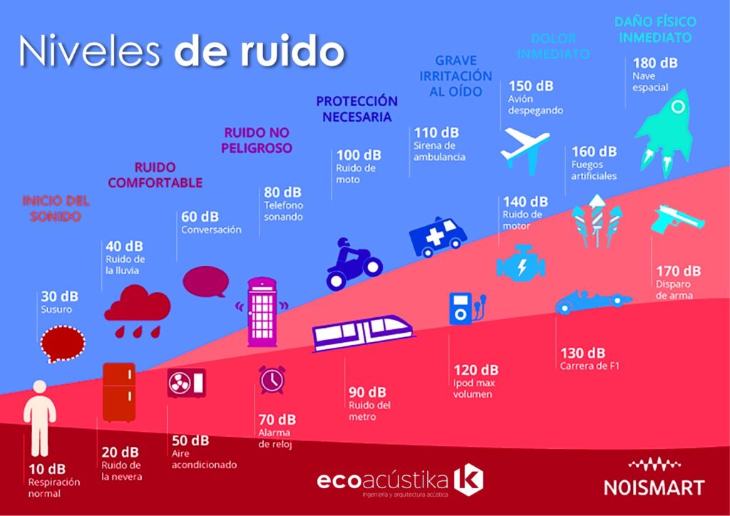 Según la lista de estudios científicos, el promedio normal para un oído humano debe ser entre 50 y 70 dB. En un culto o reunión, los decibelios pueden llegar hasta un máximo de 90 dB, pero cuando se pasa de estos niveles, y se genera más de 100 dB se está produciendo una contaminación acústica que puede causar problemas auditivos y de salud[3].