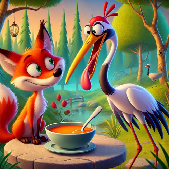 Sobre la mesa de piedra, el zorro había colocado dos platos llanos, uno frente a cada comensal. El aroma de la comida era delicioso, pero cuando la grulla miró más de cerca, se dio cuenta de que el plato contenía una sopa líquida y caliente. El zorro, con sus labios finos, se lanzó a disfrutar de la sopa, lamiendo con avidez cada gota del plato llano. La grulla, sin embargo, con su largo y estrecho pico, no pudo tomar ni un sorbo. Por más que lo intentaba, la sopa se escurría entre sus intentos y no pudo disfrutar del banquete.
