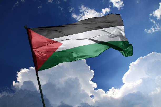 3d illustration flag of Palestine. Palestine flag isolated on the blue sky with clipping path.