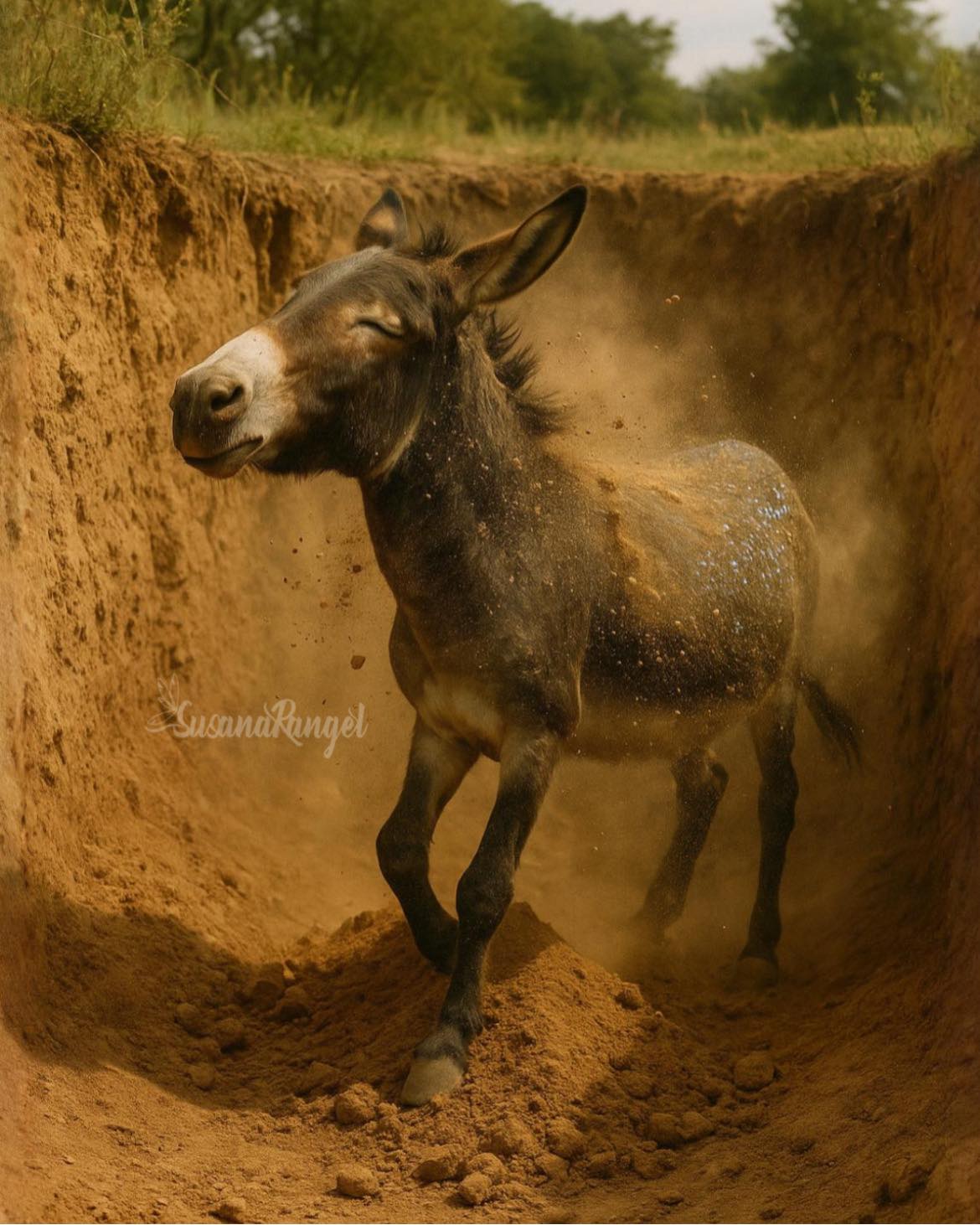 Primero se asustó. Después se agitó. Rebuznó desesperado, pero al poco tiempo algo cambió. Con cada palada, el burro sacudía la tierra de su lomo… y la pisaba. Cada vez que la tierra caía, él la sacudía y la convertía en suelo firme.