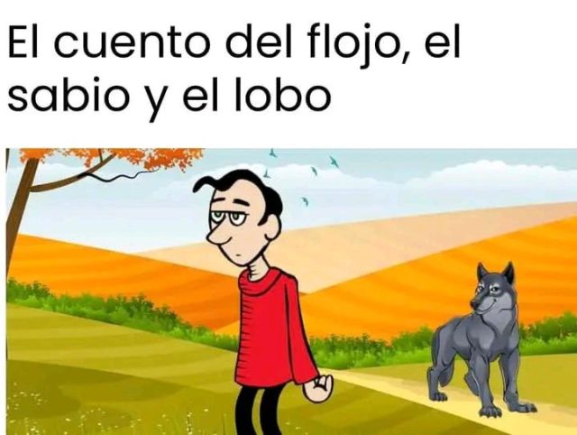 – Me contaron que tras las montañas vive un hombre muy sabio. Iré a preguntarle cómo podemos hacernos ricos…El hombre, a pesar de lo tremendamente perezoso que era, decidió cumplir su palabra, y al día siguiente, partió en busca del sabio. A mitad de camino se encontró con un lobo flaco, muyyy flaco. – ¿Dónde vas por este camino?- preguntó al flojo.